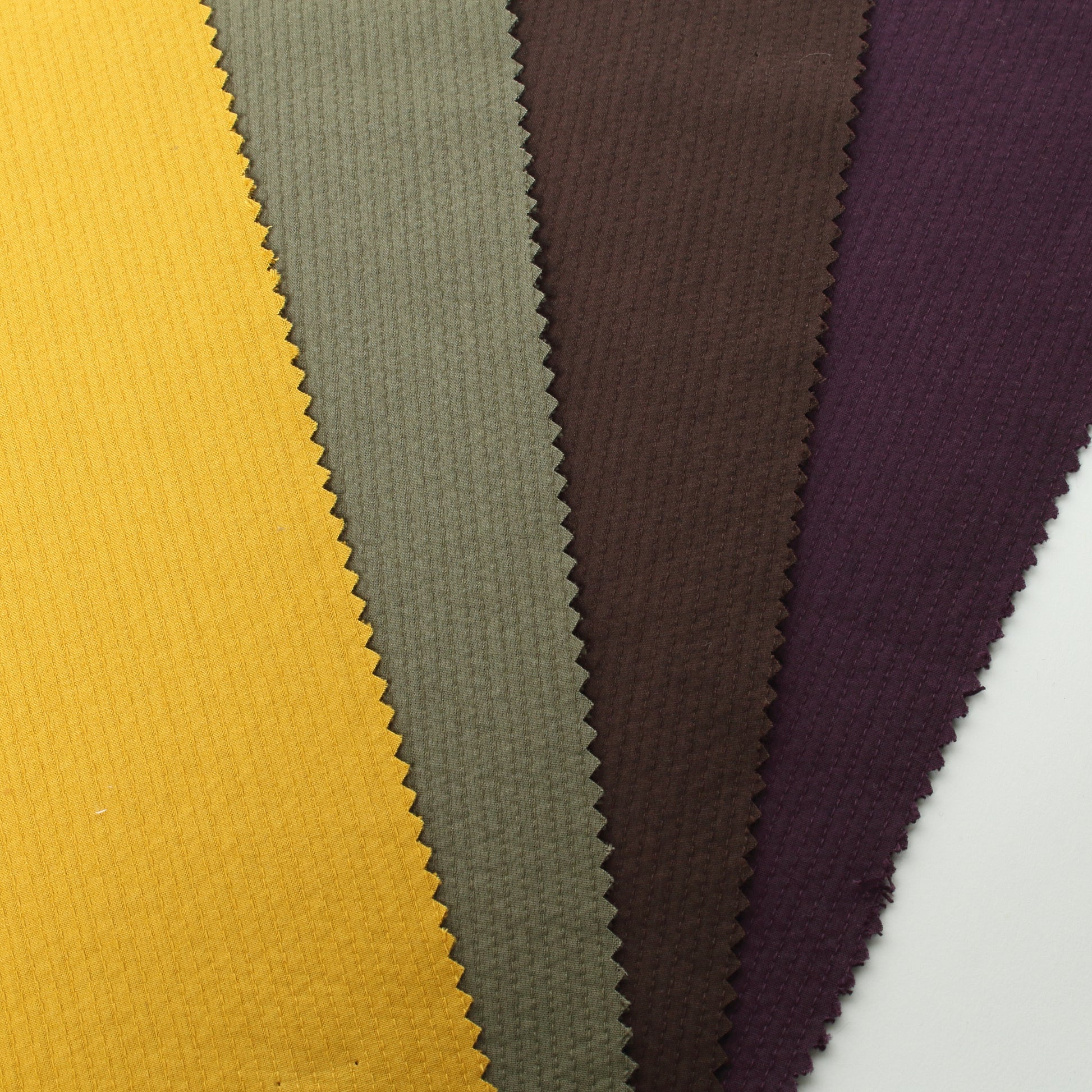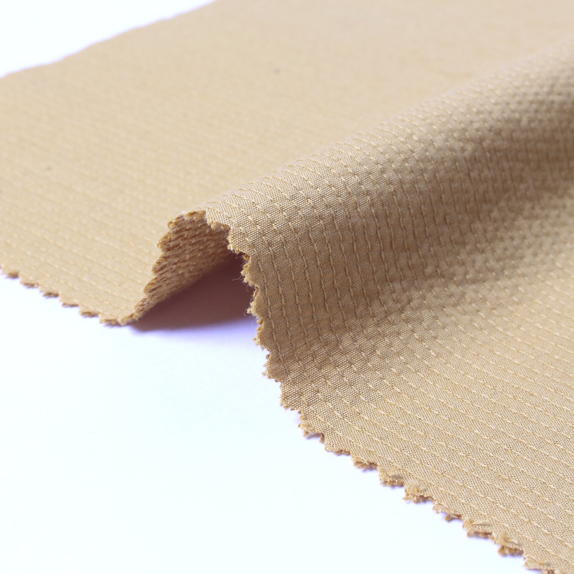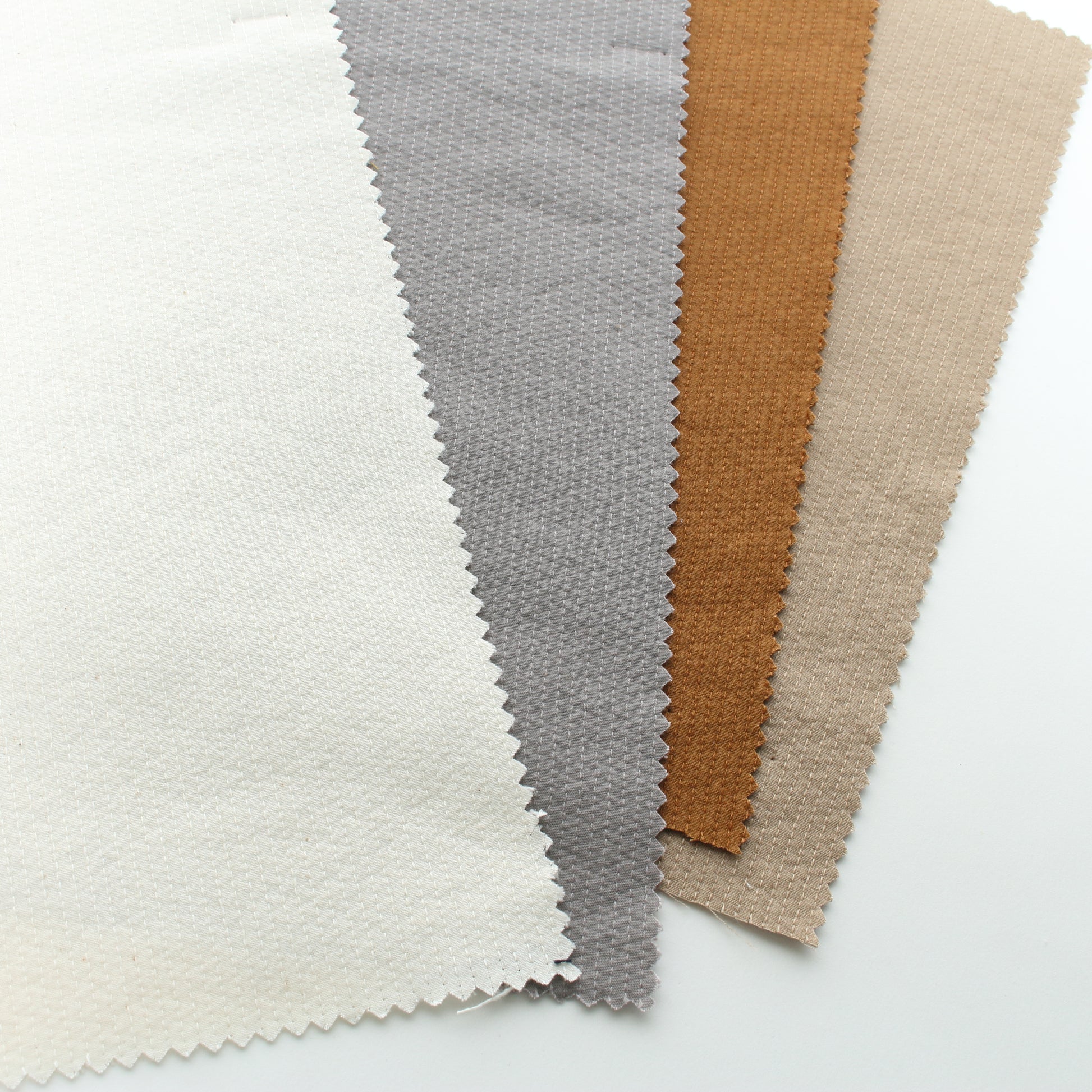 表と裏のテンションの差を利用することで、ふわふわ・ぽこぽことしたステッチが際立つクラフト感のあるドビー生地が出来上がりました。