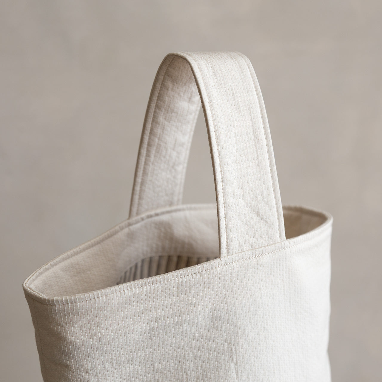 生地の表側は、密度の詰まったブロード生地を何枚か重ね合わせ、刺し子のようにステッチを施したようなそんな雰囲気。