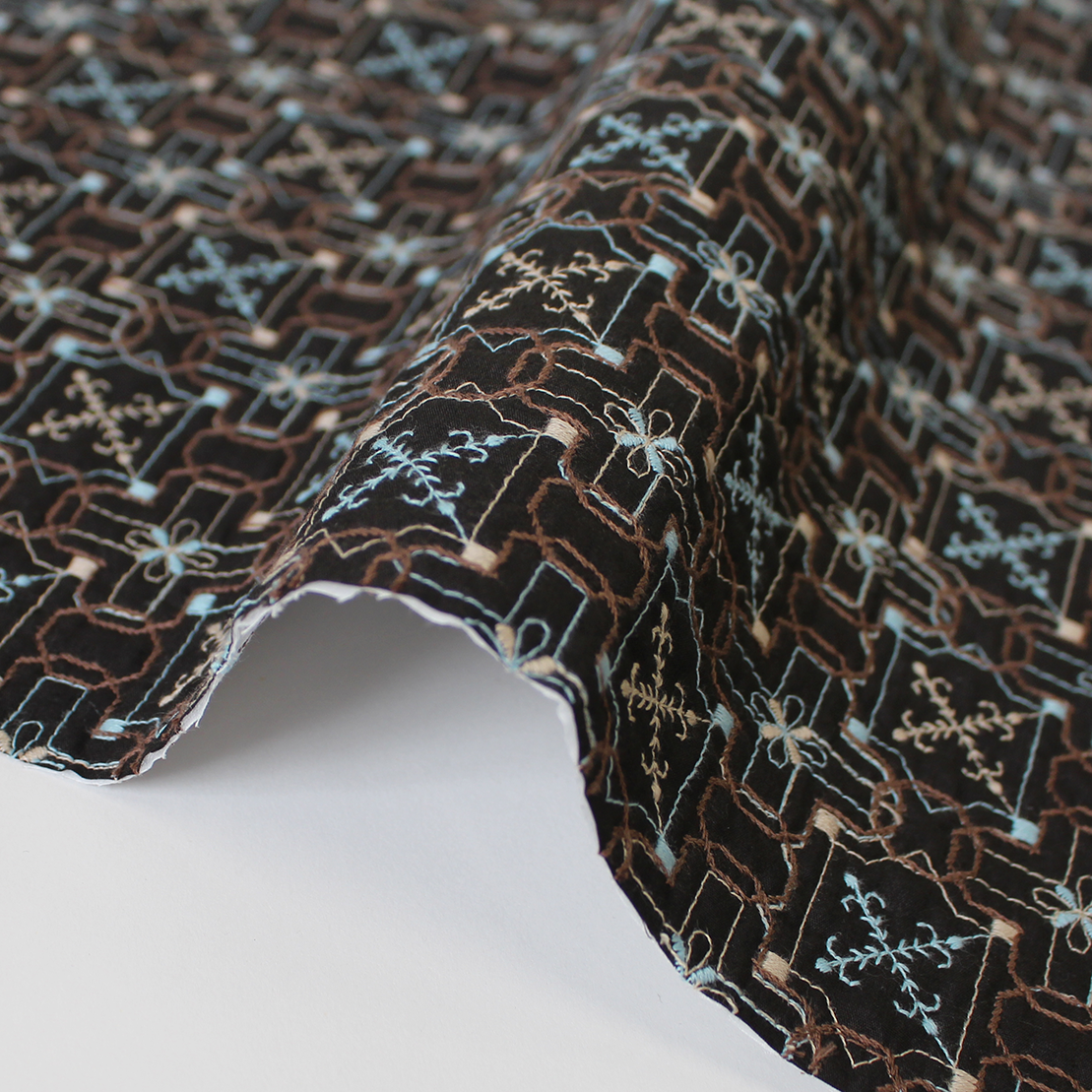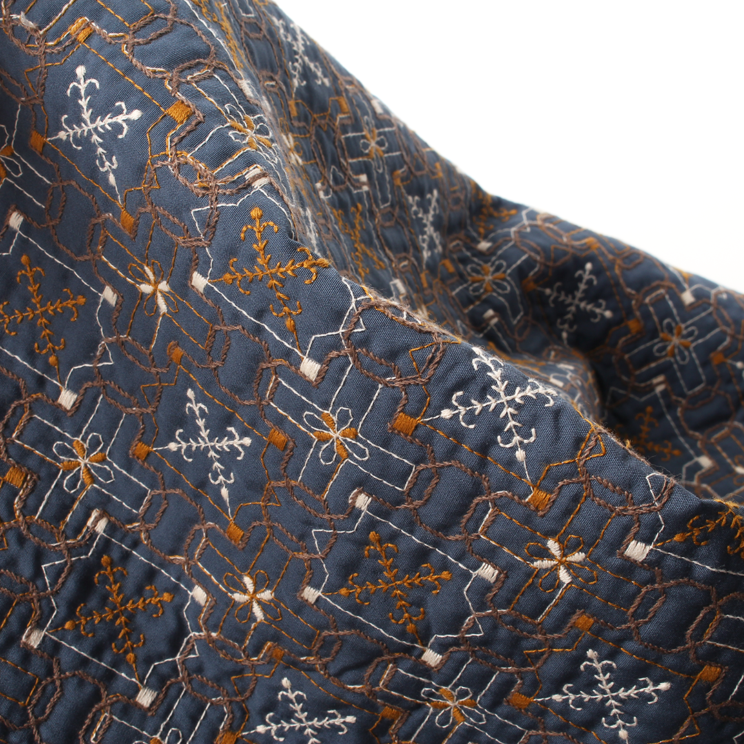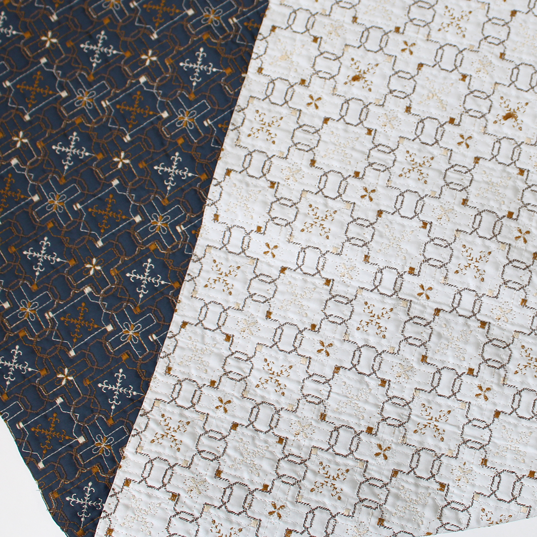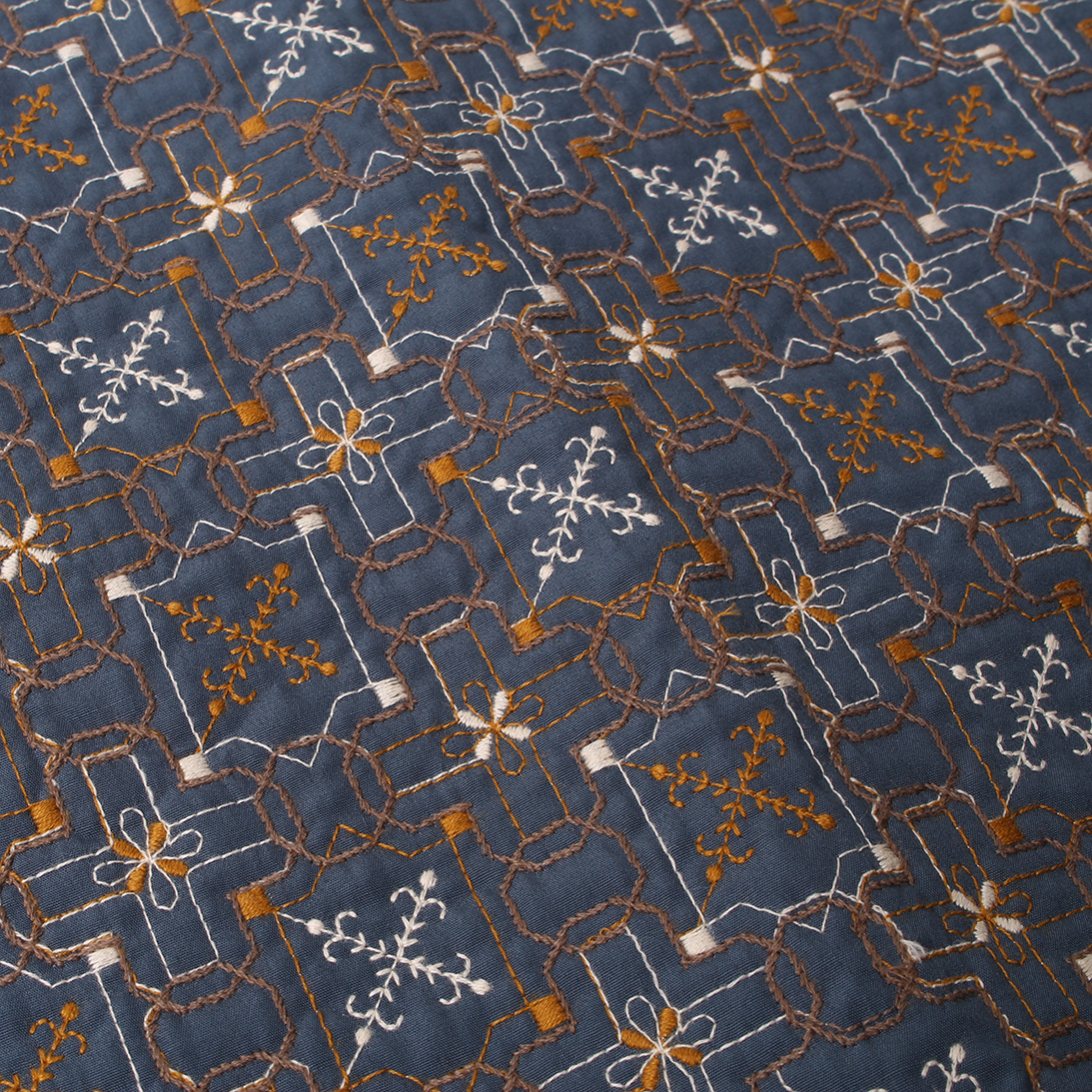 海外の壁紙からインスパイアを受けて作った柄を、自社の刺繍工場でキルティングに仕立てたオリジナルの刺繍生地です。