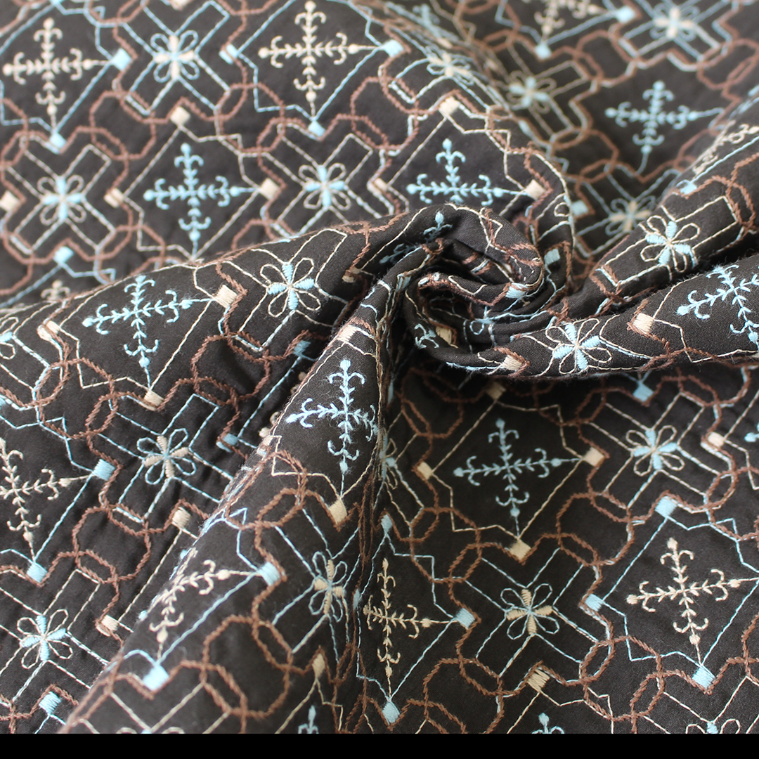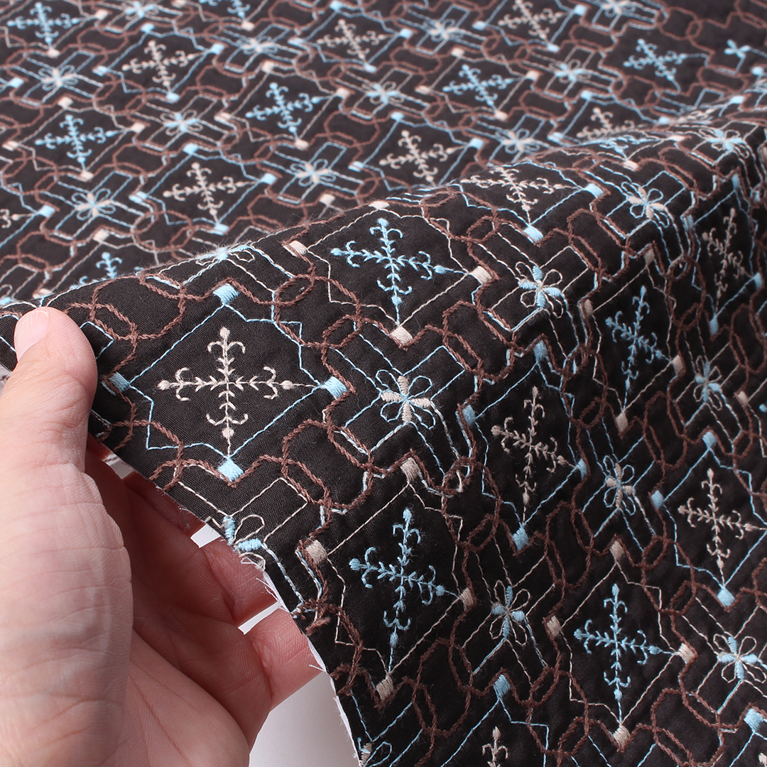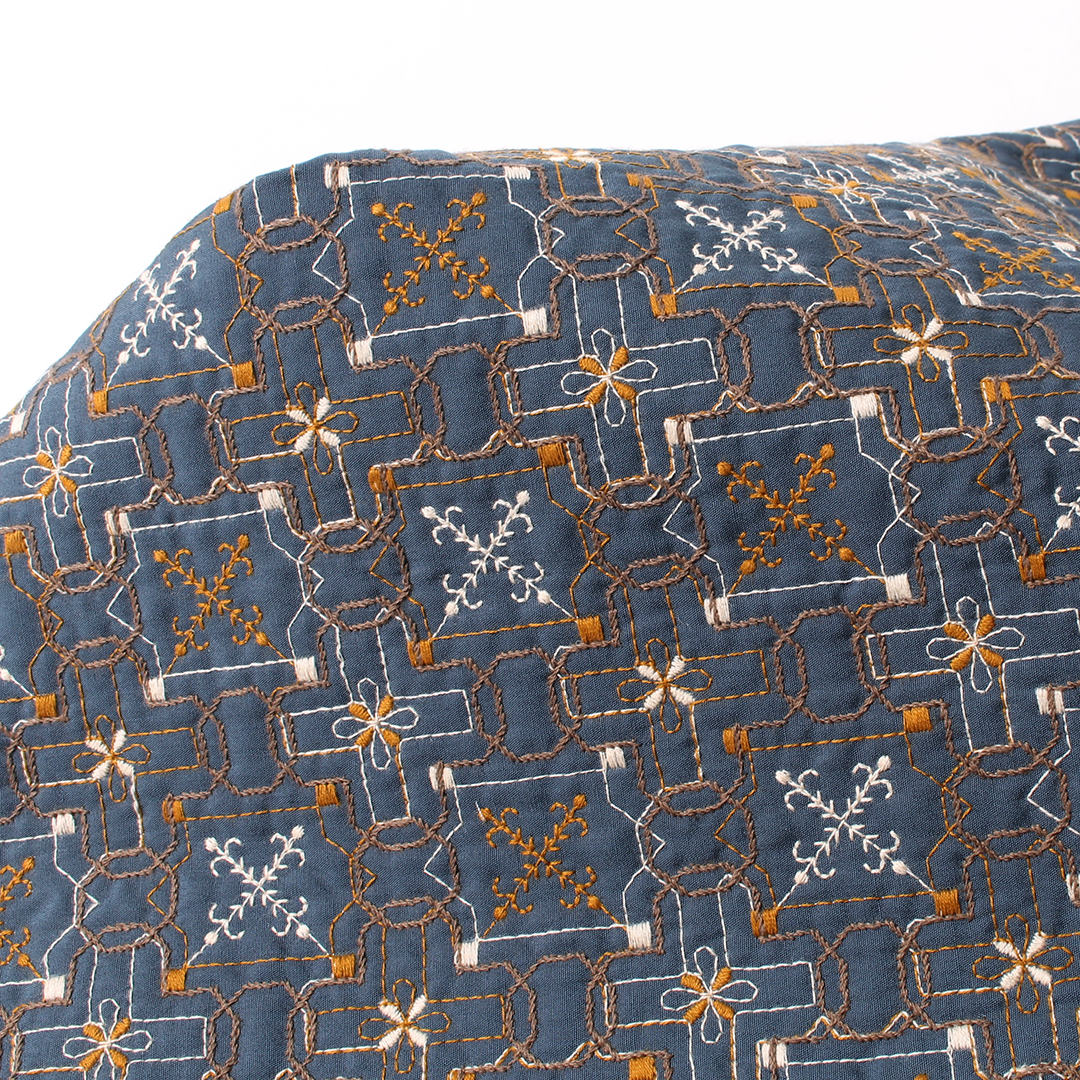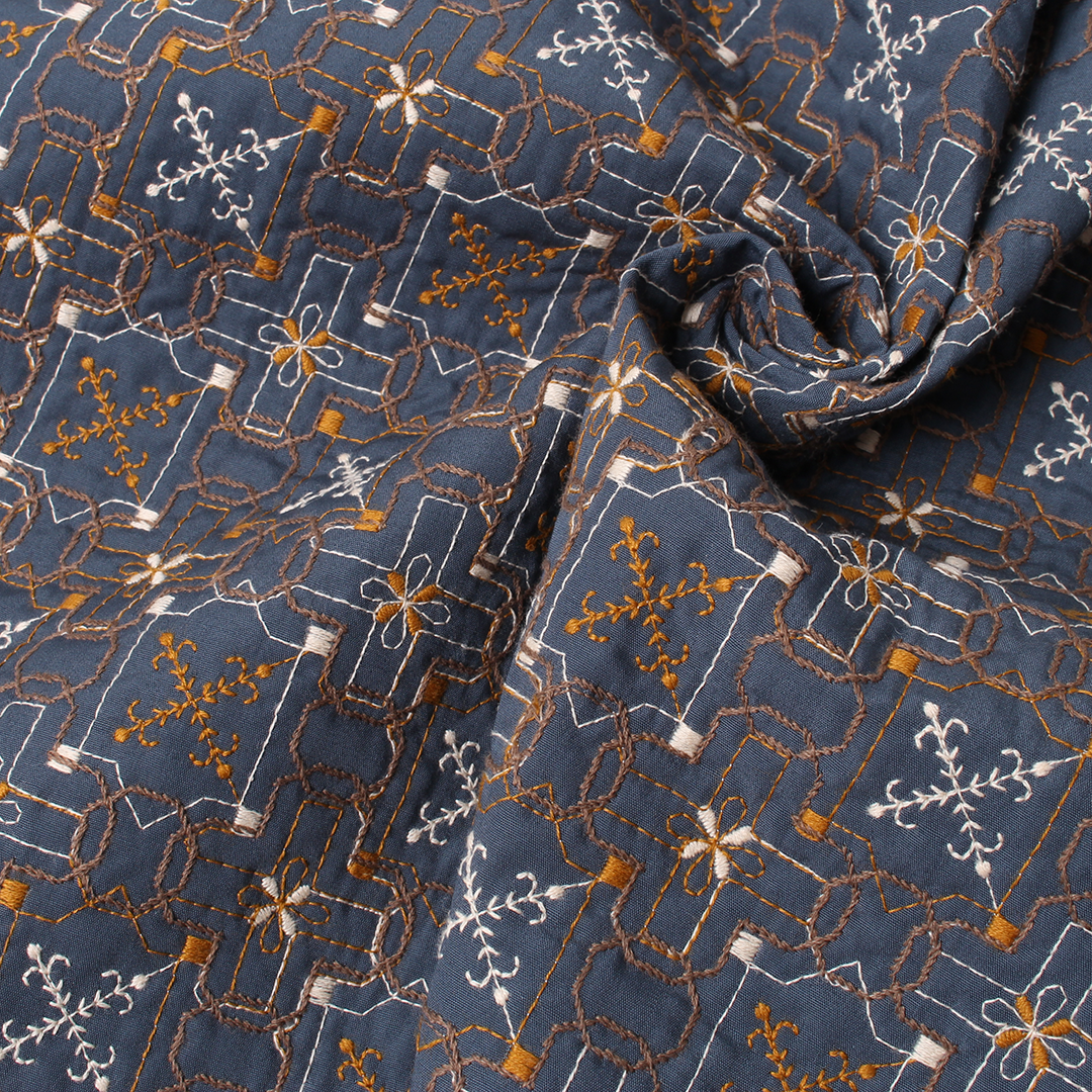 海外の壁紙からインスパイアを受けて作った柄を、自社の刺繍工場でキルティングに仕立てたオリジナルの刺繍生地です。